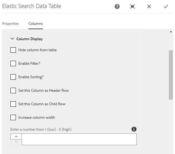The following are authoring guidelines for the Elastic Search Data Table. See also guides for Manual Data Tables, CSV Data Tables, Assets Data Tables, Content Fragment Data Tables.