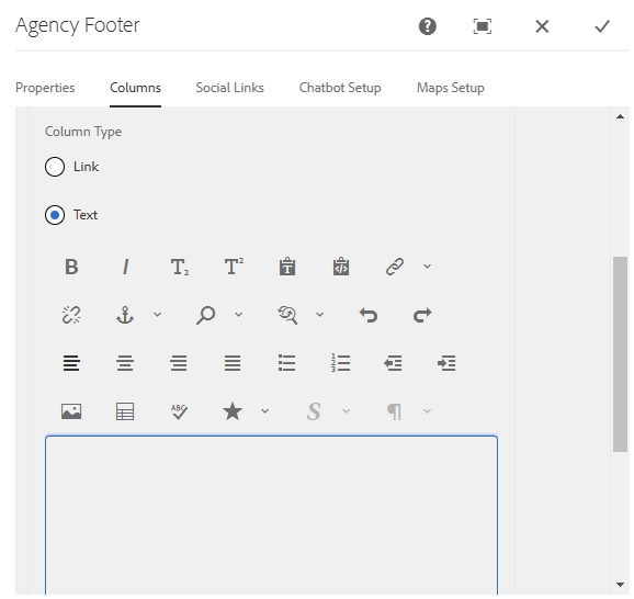 - Text: A text RTE (Rich Text Editor) is used for the column, offering the same formatting tools users are familiar with—such as bold, italics, bullet points, and hyperlinks. This allows for more expressive content, including brief descriptions, or announcements.